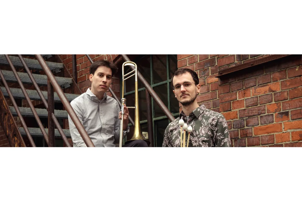 Vibraphon und Posaune – im Duo? Ungewöhnlich sagen die einen, völlig logisch, sagen Christopher Olesch und Erik Konertz. Von sanfter Intimität bis zu mitreißender Expressivität füllen Olesch und Konertz ihre musikalische Welt mit enormer Spielfreude, Virtuosität und einem feinen Gespür für klangliche Nuancen. Die stecken voller Kontraste und Überraschungen und machen immer wieder neue klangliche Ausdrucksformen möglich, die ihre Musik farbenprächtig, glitzernd und facettenreich macht. Die lange und tiefe persönliche wie musikalische Freundschaft zwischen Christopher und Erik ist das Fundament, auf dem das Duo fußt. Sie ermöglicht beiden Musikern eine intensive Kommunikation und eine spürbare, beinahe blinde Vertrautheit. Ihre stilistische Inspiration kommt von Meistern der „kleinst möglichen Formation“, etwa von Nils Wogram und Joe Sachse oder Kevin Hays und Lionel Loueke. Ohne Absprachen, immer ganz im Moment gefangen, entstehen ihre eigenen Kompositionen immer wieder neu – trotzdem klingen die beiden musikalischen und improvisatorischen Persönlichkeiten immer durch und entwickeln sich zu einer einzigartigen