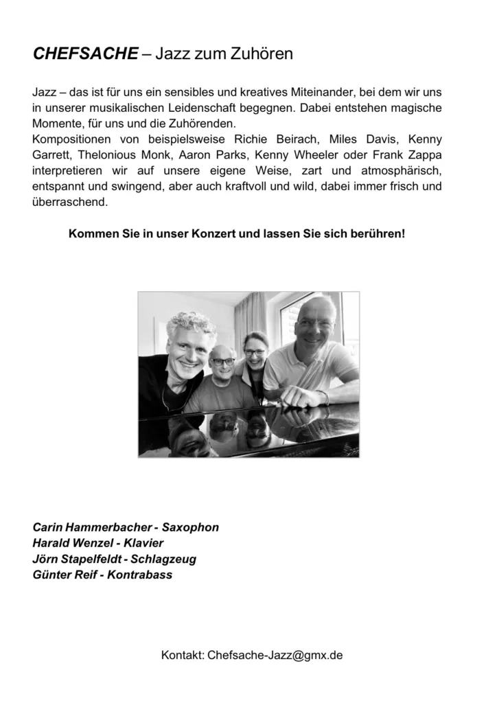 Wieder einmal geht es um die Pianisten:Sie sind es, die seit Jelly Roll Morton den Jazz durch ihre Kompositionen prägen. Neben Größen wie etwa Ellington, Monk oder Silver werden wir uns den weniger bekannten Namen und deren Stücke an diesem Abend widmen. Überraschungen sind also sicher und ich freue mich, ein weiteres Mal mit Buggy, Leon, Hendrik und Johannes auf musikalische Entdeckungsreise gehen zu können.